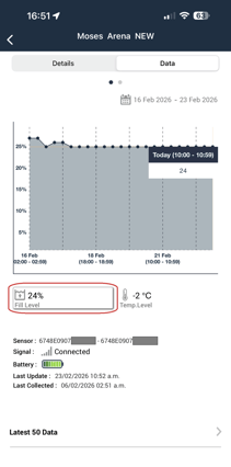 3. Confirm that the reported fill level now matches what you see inside the bin and that there is still a safe distance to the sensor.