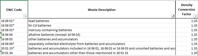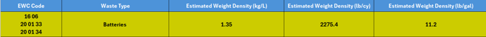 The density value for Batteries is an estimate based on research from the Scottish Environmental Protection Agency and the Agency for Statistics of Bosnia and Herzegovina.This information helps customers estimate and report batteries waste volumes, aiding waste management planning.