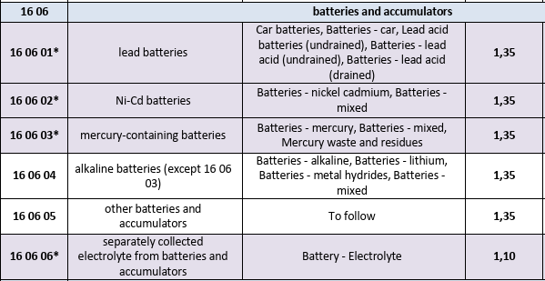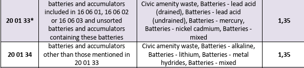 The Scottish Environmental Protection Agency and the Agency for Statistics of Bosnia and Herzegovina classify batteries under the EWC code 16 06, 20 01 33 and 20 01 34, which includes lead batteries, Ni-Cd batteries, mercury-containing batteries, alkaline batteries (except 16 06 03), and other batteries and accumulators.
