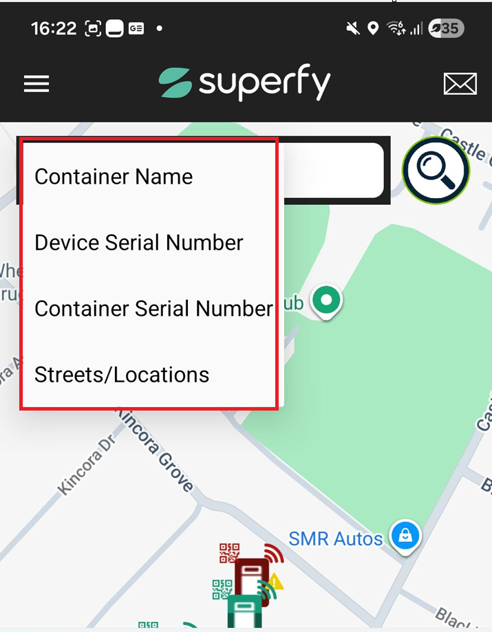 Alternatively, use the Magnifying Glass located at the top left-hand side in the Map View to search by Address, Container Name, Container Serial Number, or Device Serial Number.