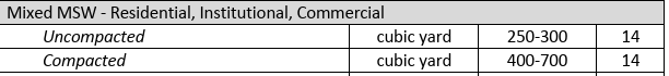 In comparison, the Volume-to-Weight Conversion Factors report by the New Hampshire Department of Environmental Services reports an estimated weight range of 500 to 1,000 lbs per cubic yard in a truck. To reconcile these values, we chose the average of 500 lbs per cubic yard, which converts to 0.29664 kg/L, rounded to 0.30 kg/L.