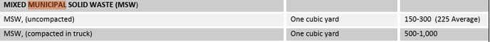 According to a report from the U.S. Environmental Protection Agency, titled Volume-to-Weight Conversion Factors, the estimated weight of mixed general waste (compacted) ranges from 400 to 700 lbs per cubic yard.