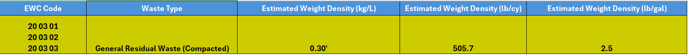 The density value for Mixed General Waste (Compacted) is an estimate based on research from the U.S. Environmental Protection Agency and The New Hampshire Department of Environmental Services. This information aids customers in estimating and reporting on mixed general waste (compacted) volumes, facilitating effective waste management planning.