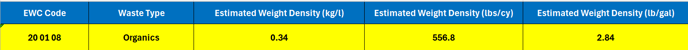 The density value for Organic Waste is an estimate based on research from the Irish Environmental Protection Agency (EPA) and the Minnesota Pollution Control Agency. This information aids customers in estimating and Organic Waste volumes, facilitating effective waste management planning.