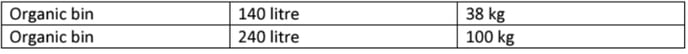 The table below, extracted from a report published by the Irish Environmental Protection Agency titled National Waste Statistics: Guidance for Estimating Quantity of Waste Generated On-Site, outlines the typical weights of Organic Waste when the bins are full, categorized by different bin sizes.
