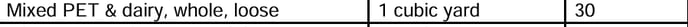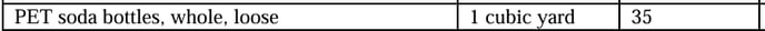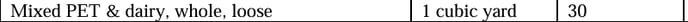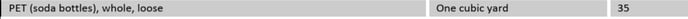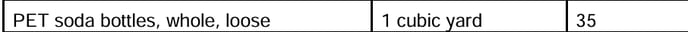 According to the U.S. Environmental Protection Agency's report titled Standard Volume-to-Weight Conversion Factors, the weight of PET soda bottles is estimated at 35 pounds per cubic yard (lbs/cy), while mixed PET and dairy containers weigh approximately 30 lbs/cy which converts to 0.020kg/L.