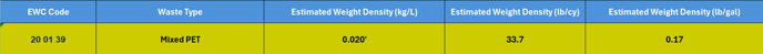The density value for Mixed PET waste is an estimate based on research from the U.S. Environmental Protection Agency, New Hampshire Department of Environmental Services, Grand Traverse County and King County. This information aids customers in estimating and reporting on mixed general waste (compacted) volumes, facilitating effective waste management planning.